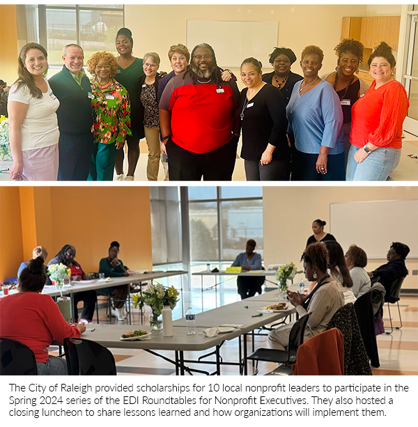 Two photos of nonprofit leaders attending closing lunch of the EDI Roundtables for Nonprofit Executives hosted by City of Raleigh, North Caroliina