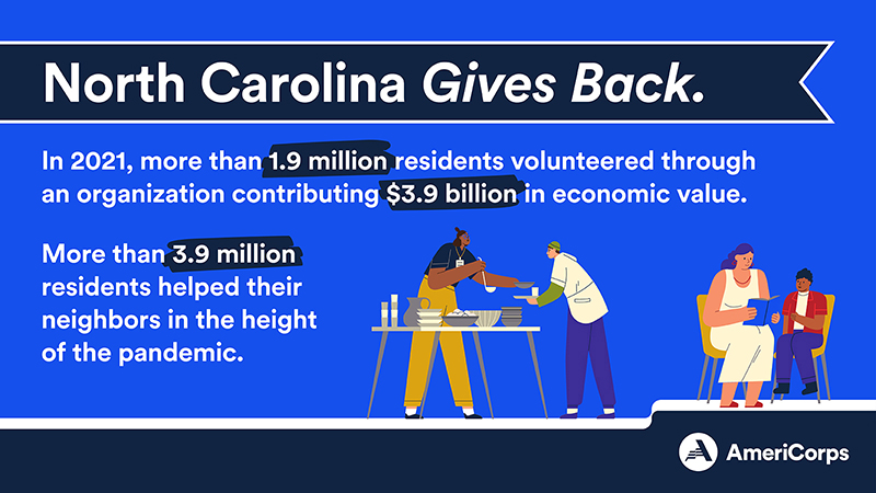 In our home state, 22.8 percent of North Carolinians, or 1.9 million people, formally volunteered, contributing a total of 139.5 million hours of service. This means that NC volunteers provided the service equivalent of about 67,000 full time employees.